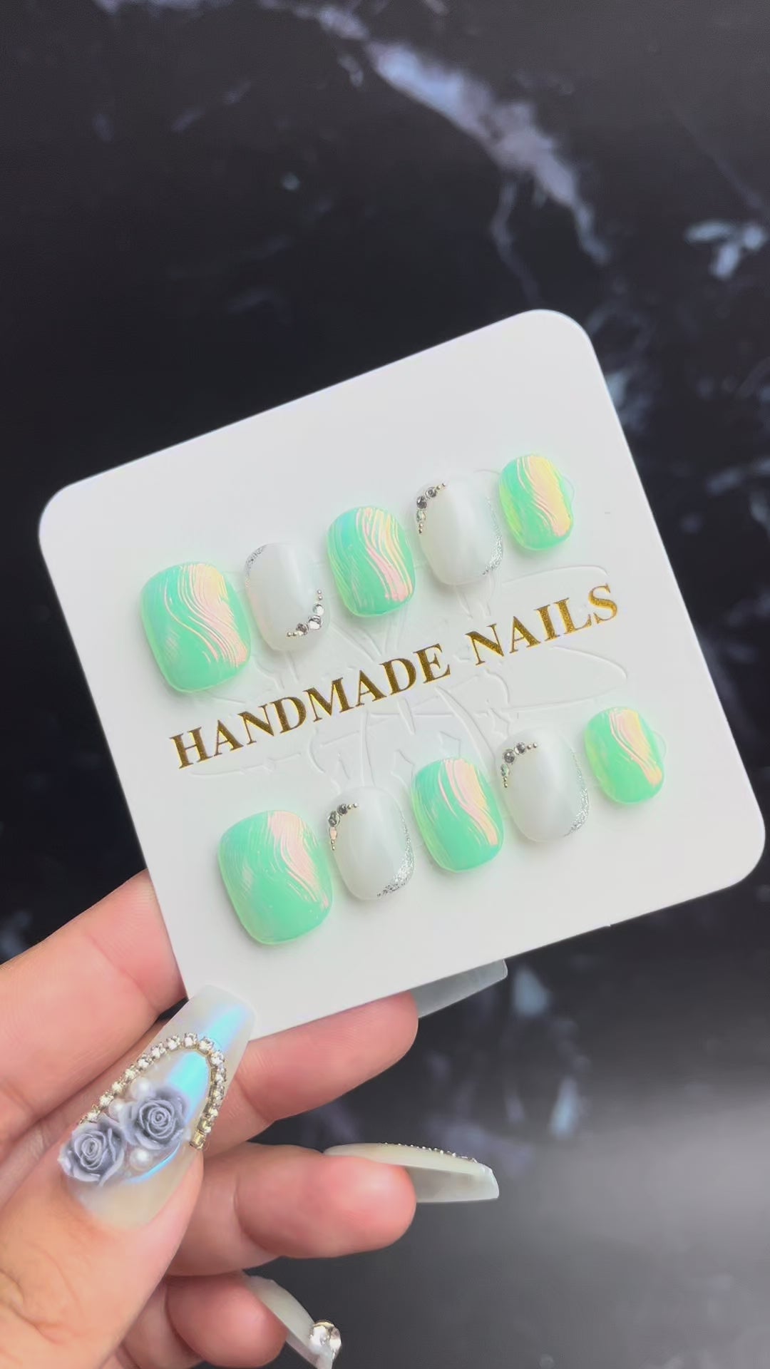 爽やかなミントグリーンにオーロラのような輝きを重ね、まるで海辺の光を閉じ込めたような透明感あふれるデザイン。光の角度によって繊細に色が変わり、指先を優しく包み込む幻想的な雰囲気を演出します。