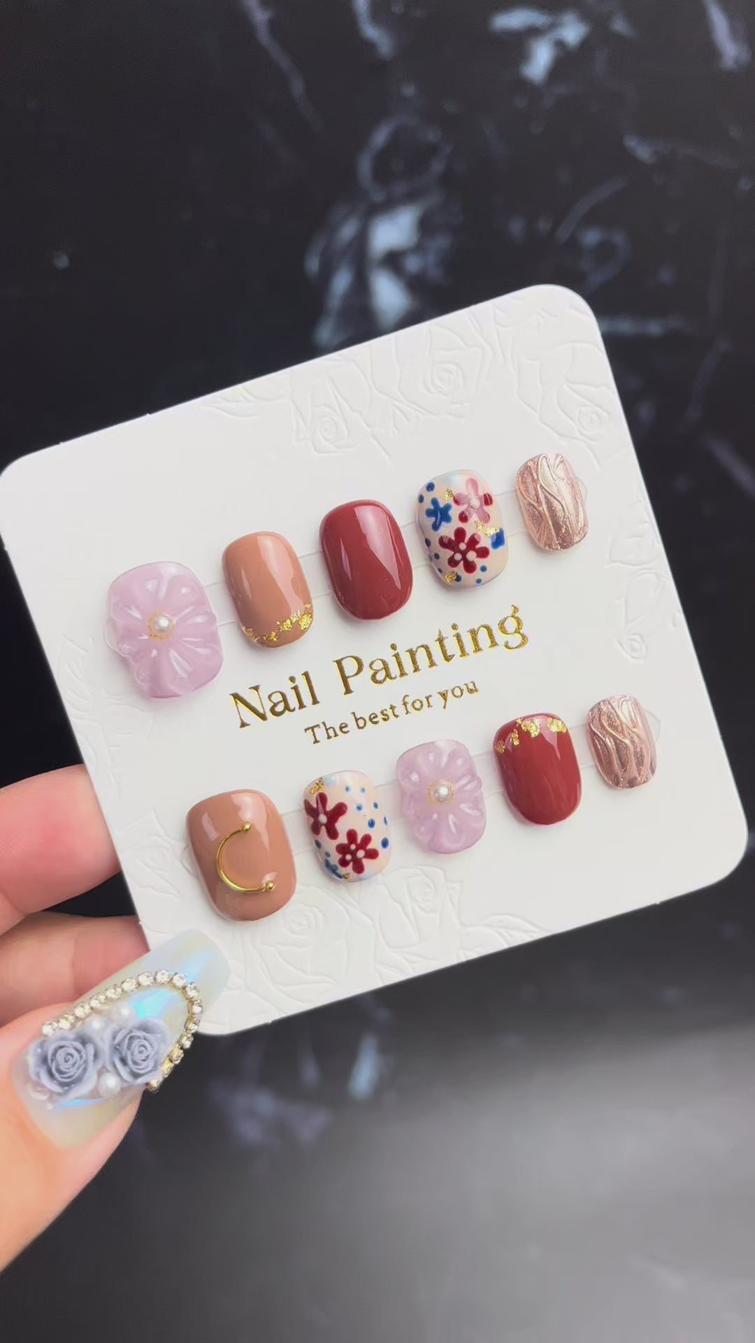 落ち着いたテラコッタブラウンをベースに、華やかなレッドとネイビーのフラワーアートを散りばめたデザイン。温かみのあるカラーに立体的なフラワーパーツとメタリックゴールドを組み合わせ、秋冬らしい深みと上品さを演出します。