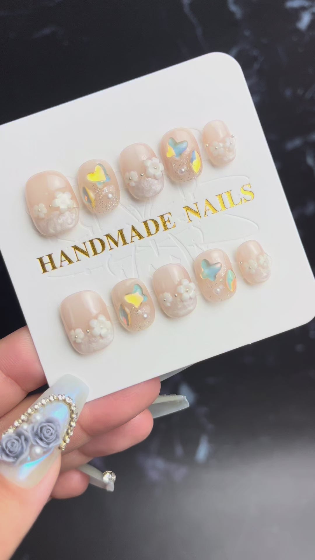 ヌーディーベージュをベースに、繊細な3Dフラワーとオーロラに輝くバタフライを組み合わせたネイルチップ。角度によって変化する光沢が、指先に可憐で幻想的な雰囲気をプラスします。